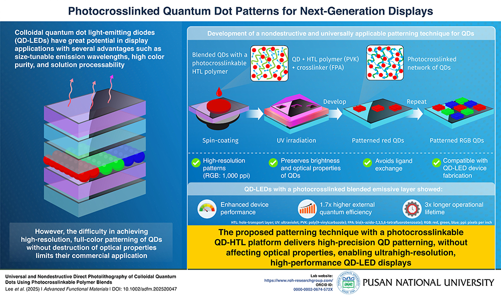 To address this, a research team led by Associate Professor Jeongkyun Roh from the Department of Electrical Engineering, Pusan National University, Republic of Korea, has introduced a universal, photoresist-free, and nondestructive direct photolithography method for QD patterning. Instead of exposing QDs to harsh chemical modifications, the team engineered a photocrosslinkable blended emissive layer (b-EML). This layer is formed by mixing QDs with a hole-transport polymer and a small fraction of an ultraviolet (UV)-activated crosslinker, enabling precise patterning while preserving QD integrity. The study was published in the journal of Advanced Functional Materials on 29 September 2025.