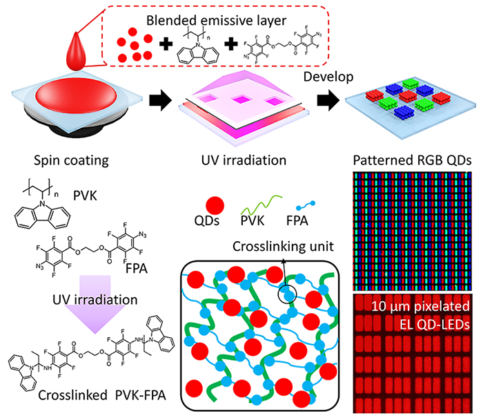 이 기술은 양자점을 정공수송층 고분자(PVK)와 광가교제(FPA)와 섞은 뒤 자외선을 쏘이면, 고분자끼리 서로 단단히 연결돼 3차원 그물망 구조를 만들고, 그 사이에 양자점이 안정적으로 고정되는 원리다. 이 과정을 통해 원하는 위치에만 양자점을 정확하게 남길 수 있어 매우 높은 해상도의 미세 패턴 구현이 가능하다.